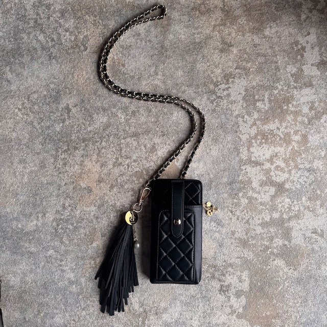 【追加 加工オプション】 ショルダー紐の長さ延長をご希望の方は下記URL(加工オプション)をご購入ください。 ↓ショルダー紐の長さを約120~140cmまで調整できます。 https://hippopo.thebase.in/items/122801744 スマホもカードもお札も 必要なものはこれひとつに。 上質なキルティング×ゴールドチェーンの“洒落感”で、どんなシーンもサマになる。 • フロントポケットにはスマホをサッと収納 • カード4枚&お札もきちんと整理 • ファスナー付き小物ポケットで安心収納 オフィスにもお出かけにも、 “財布+スマホ+小物”が1つで完結する頼れる相棒。 サブバッグとしても、これだけ持って身軽にお出かけも。 ⸻ 【サイズ】 • 本体: 縦:約18cm横:約9cm • チェーンストラップ:約115cm • タッセル:約11cm 【仕様】 • スマホ用フロントポケット • カードポケット×4 • お札入れ • 小物ポケット(ファスナー式) • スナップボタン開閉 【素材】 • 合皮、メタルパーツ、ポリエステル、コットンパール 【Attention】 • 素材の特性上、摩擦や水濡れにはご注意ください。 • スマホのサイズによっては一部収納できない場合がございます。 ※ セレクト商品をベースに、当店でアレンジ・カスタムを施しております。 【ご注意とお手入れについて】 ・タッセルやリボン部分は、無理に引っ張らないでください。 ・アクセサリーや金具部分は、お手入れ布で水分や油分を拭き取り、密閉袋での保管を推奨します。 ・一部パーツは金属アレルギー非対応です。異変を感じた場合は直ちにご使用を中止してください。 ・繊細なハンドメイド作品です。既製品よりも強度が劣る場合がございますので、お取り扱いにはご注意ください。 ・水濡れ、湿気、直射日光は色落ちや変色の原因になります。ご注意ください。 ・小さなお子様やペットの誤飲にご注意ください。誤飲については責任を負いかねます。 ・ご購入後1ヶ月間の自然故障は無料修理いたします。お気軽にご連絡ください。 ・羽、ファー、タッセル等を使用した作品は、型崩れにご注意の上、保管ください。 ・画面上の色味はご使用の端末により実物と異なる場合がございます。