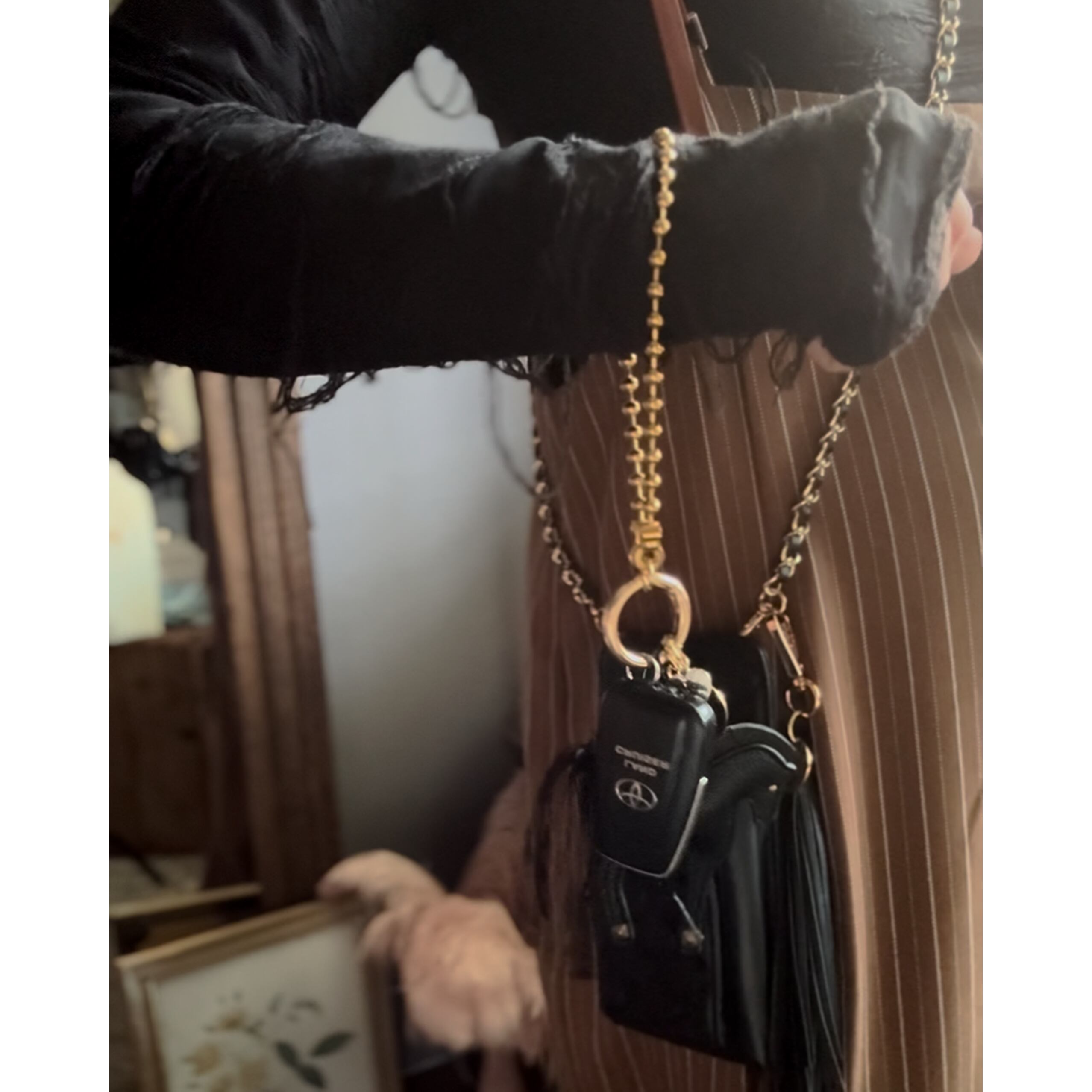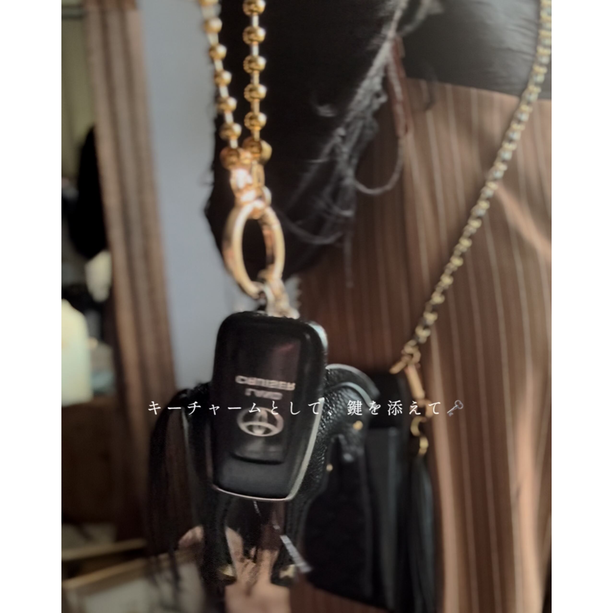揺れるチェーンと艶めく金具が、動くたびに存在感を放ち、